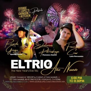 • It's my great pleasure to announce I'll be ringing in the New Year with the Virtuoso on Spanish Guitar and Vocals Ricardo Griego @ricogriego and the Ultra Talented Flamenco Dancer, Ekaterina Pokrovskaya. Once again, we'll be starting off the festivities at 5pm at the famous @George Lopez's Chingon Kitchen. If you're in town, swing by and experience EL TRIO!